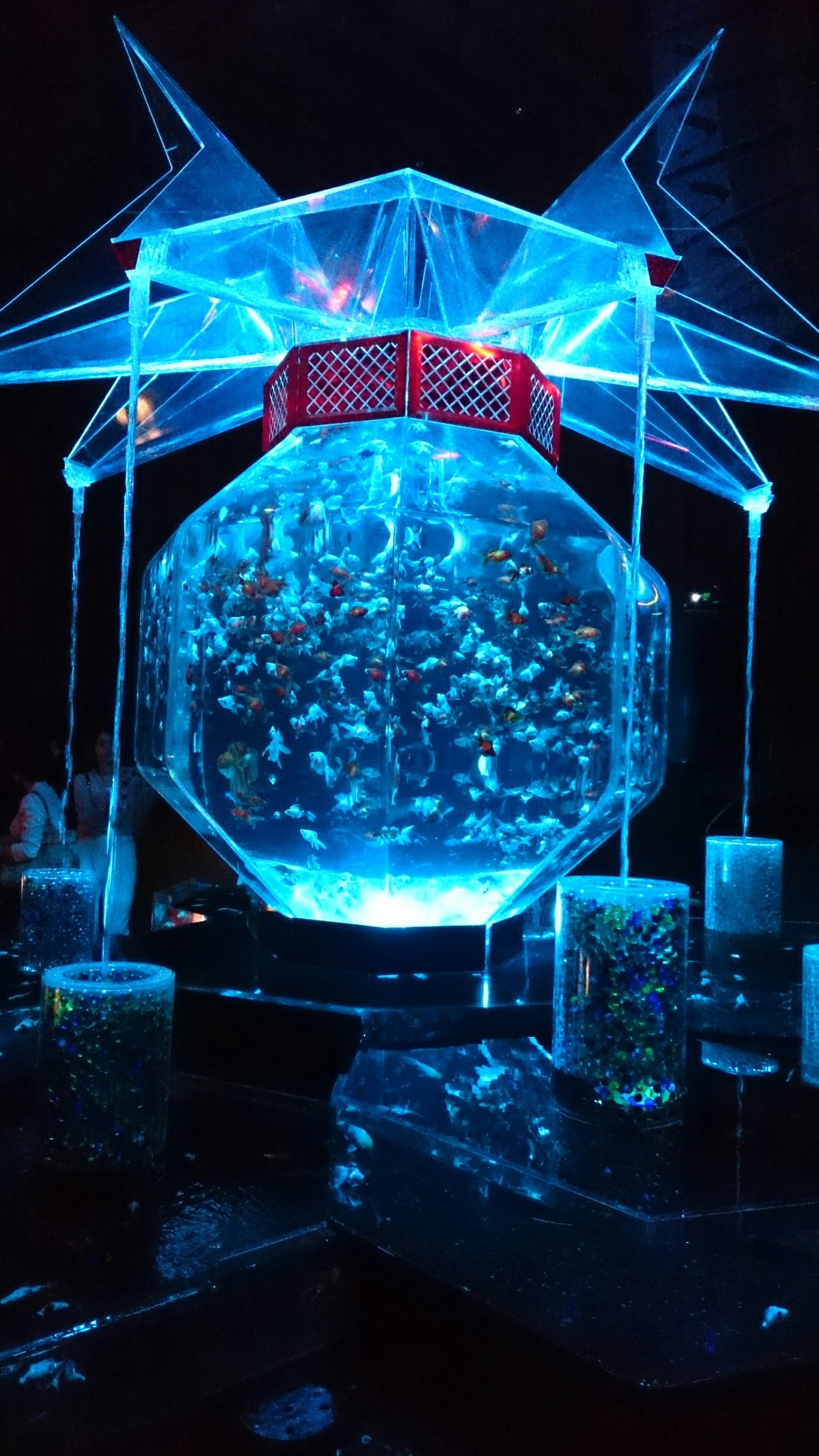 生きている金魚が、綺麗な照明や水槽に入っていることで